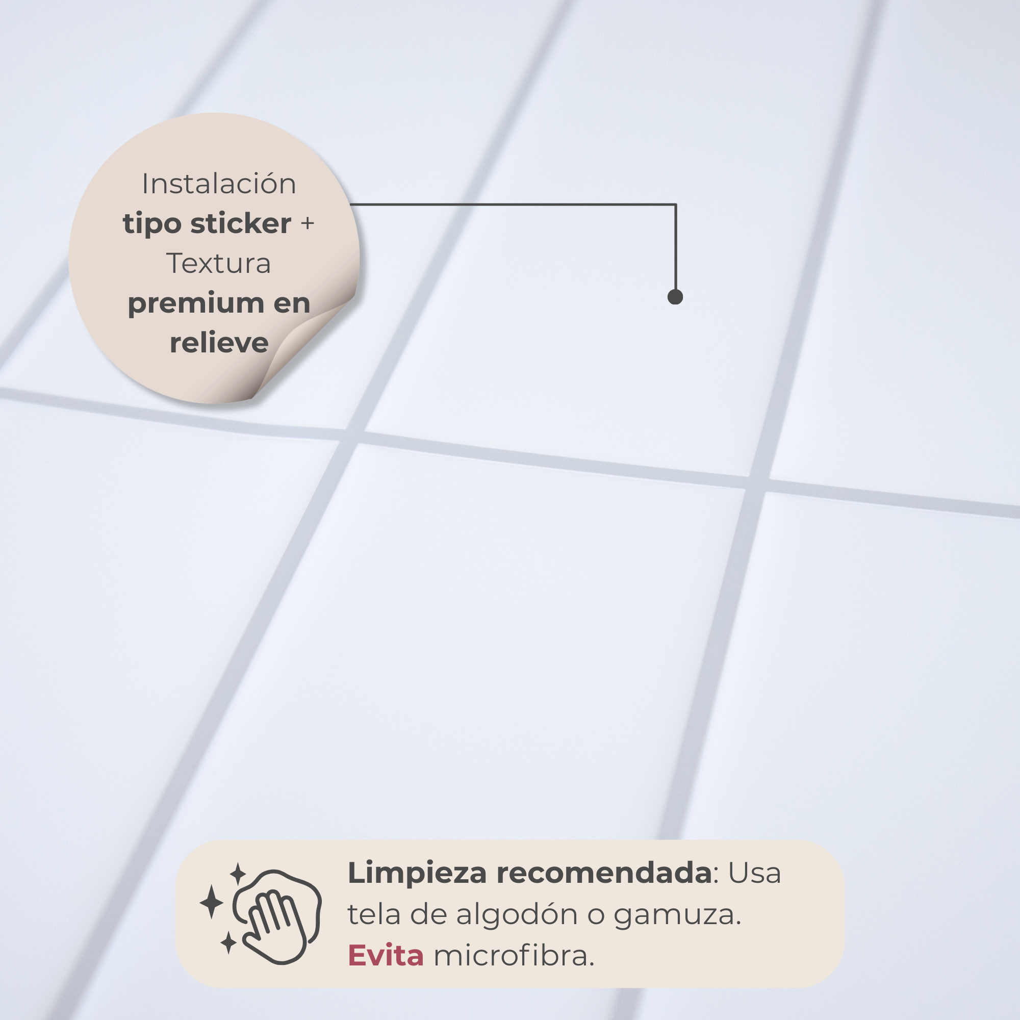 Su acabado mate resalta la luz natural, y su instalación autoadhesiva permite renovar cualquier muro en minutos, sin obra ni herramientas.