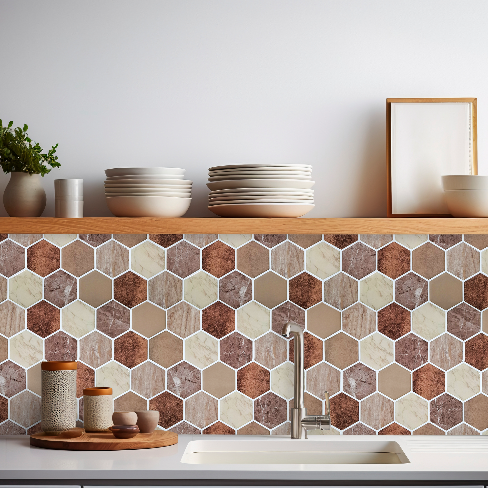 Sus tonos terracota y vetas marmoleadas evocan el resplandor del sol sobre la arcilla, creando una atmósfera acogedora y sofisticada. Perfecto para cocinas o baños que buscan un estilo cálido y contemporáneo.