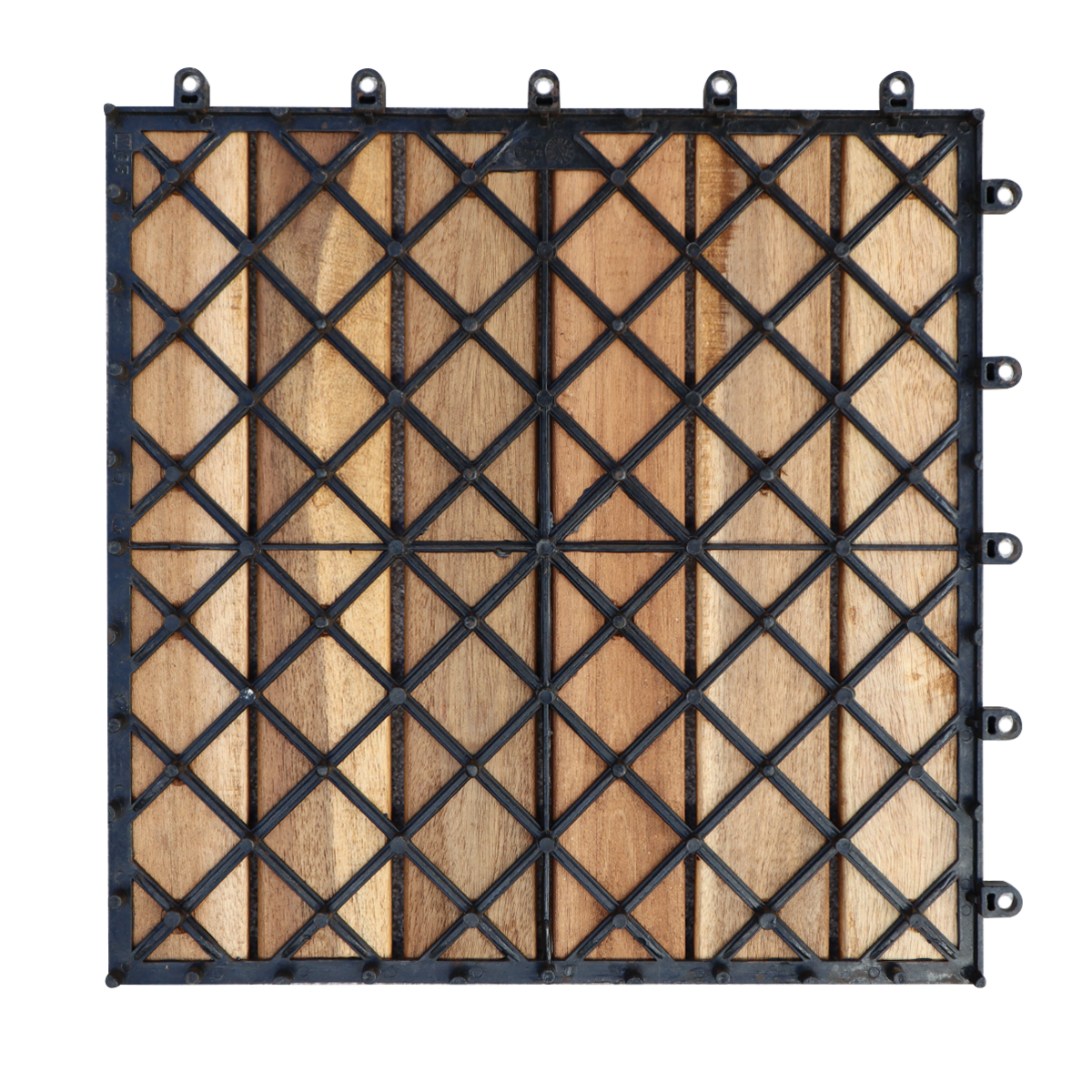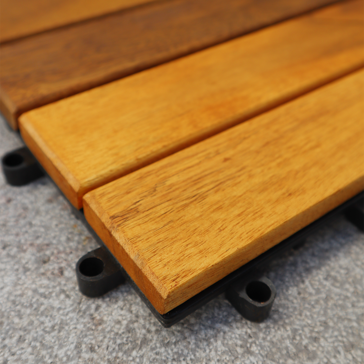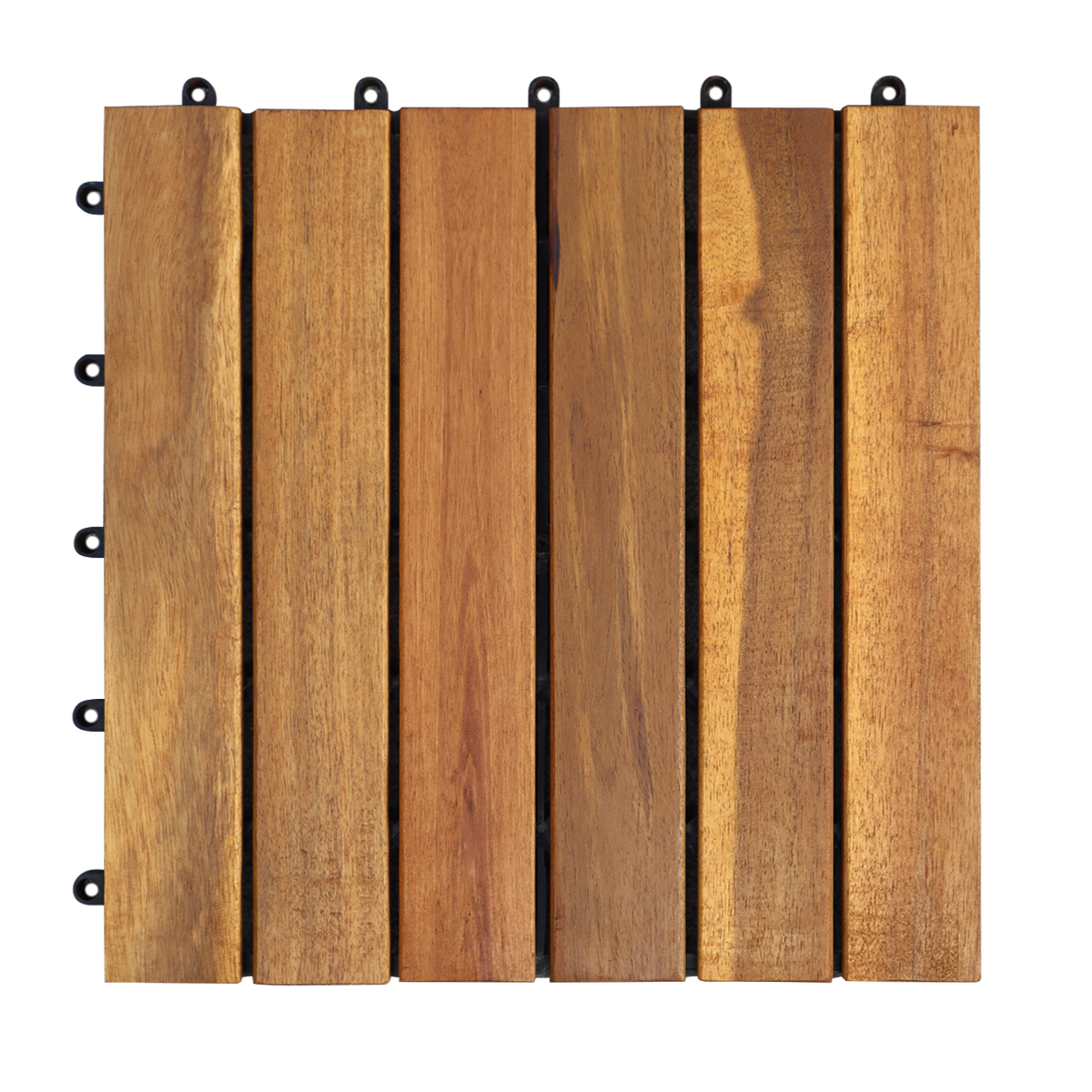 Hecho en madera de acacia tratada para resistir la intemperie, se instala sin herramientas gracias a su sistema modular de encaje.