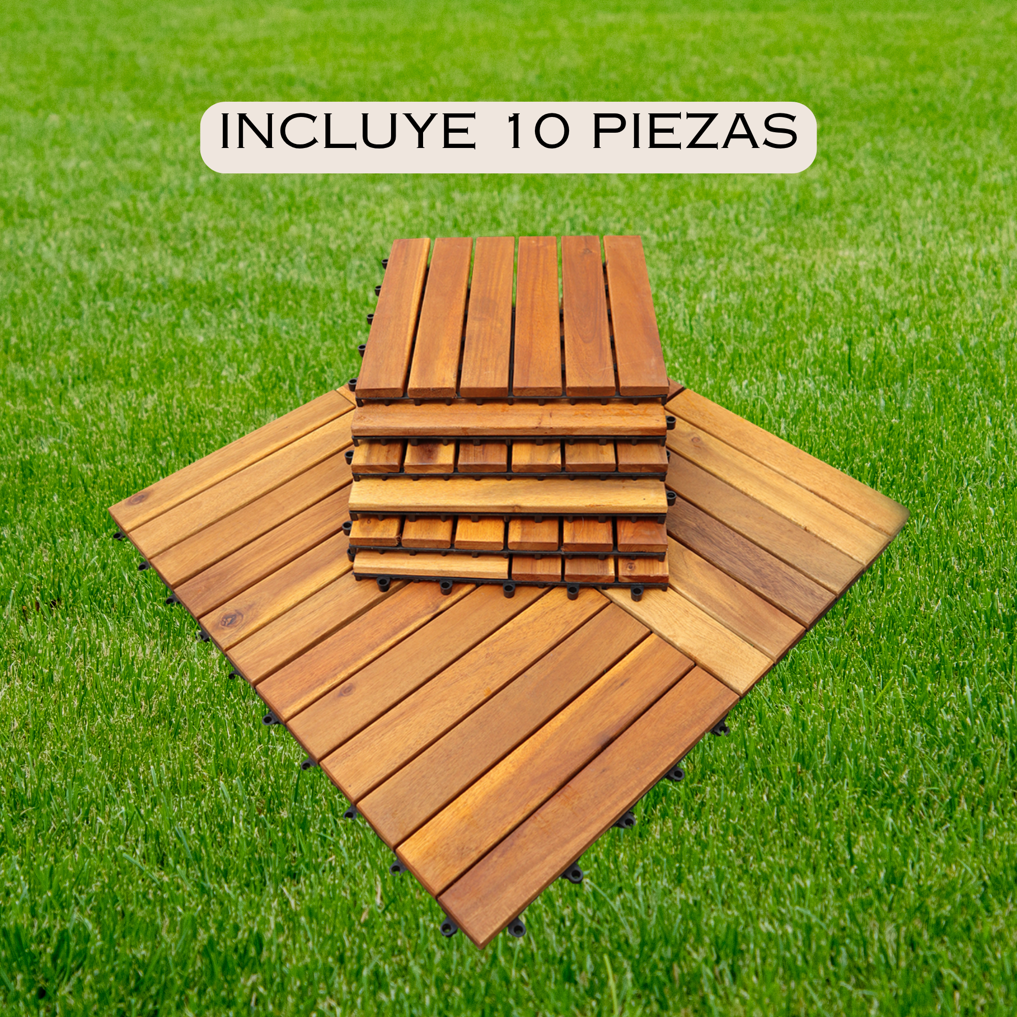 Dimensiones: 10 piezas por caja, 30 x 30 cm (2.4 cm de altura) por baldosa y Una caja cubre 0.93 m²